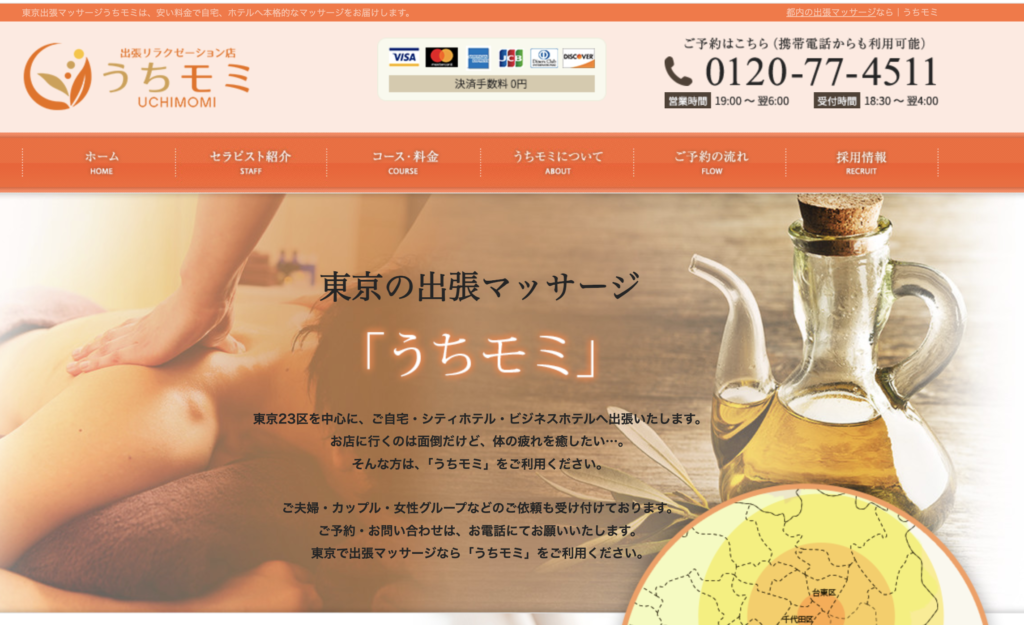 出張マッサージ うちモミは、秋葉原を中心に東京23区内へ出張するリラクゼーションマッサージ店です。深夜も対応しており、仕事帰りや終電後でも気軽に利用できます。