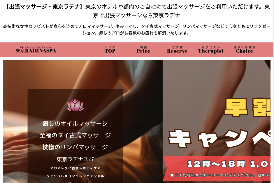 東京ラデナスパは、都内23区のご自宅やホテルへ伺う出張専門のリラクゼーションサロンです。